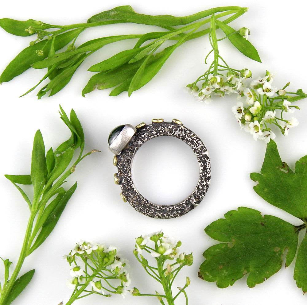 Organic, chunky, sturdy, and beautifully textured - a beautiful green Tourmaline is set on an organic band adorned with brass accents. The Tourmaline measures 10 x 8mm. The width of the band is approx. 3mm. There is a lovely substantial weight to this ring. One of a kind.